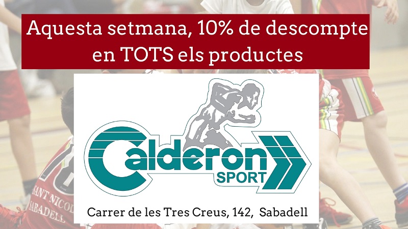 Coneix als nostres Protagonistes d’aquesta setmana patrocinada per Calderón Sport Sabadell. Recordem que Calderón Sport Sabadell (Carrer de les Tres Creus, 142, Sabadell) ofereix un 10% de descompte en tots els productes durant tota aquesta setmana als socis (inclòs familiars) del CE Sant Nicolau.
