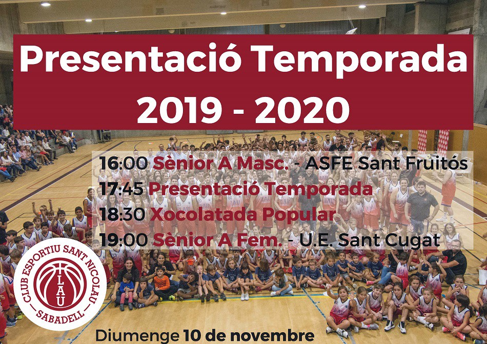 El proper diumenge 10 de novembre a la tarda tindrà lloc l’acte de Presentació de tots els equips i seccions del Club Esportiu Sant Nicolau. Enguany comptem quasi bé amb 400 esportistes, començant pels grups dels més menuts que realitzen iniciació esportiva i psicomotricitat i acabant pels equips de la secció de basquetbol.