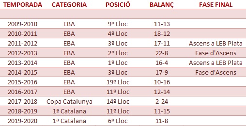 Enguany l’equip ha millorat les seves prestacions, amb les continuïtats de “veterans” com Carles Rodríguez, Dani Juan, Adrià Escudero, Pol Sardó i Jordi Navarro. Completen la segona temporada de Sèniors per consagrar-se a l’equip i a la categoria, Joan Malonga, Pep Costa i Jan Hansen, columna vertebral que queda ben potenciada per 3 incorporacions de luxe: Carles Casanova provinent del CB Santfeliuenc, Guillermo Baltà del CB Granollers i Pablo Moreira, provinent de la UESC.
