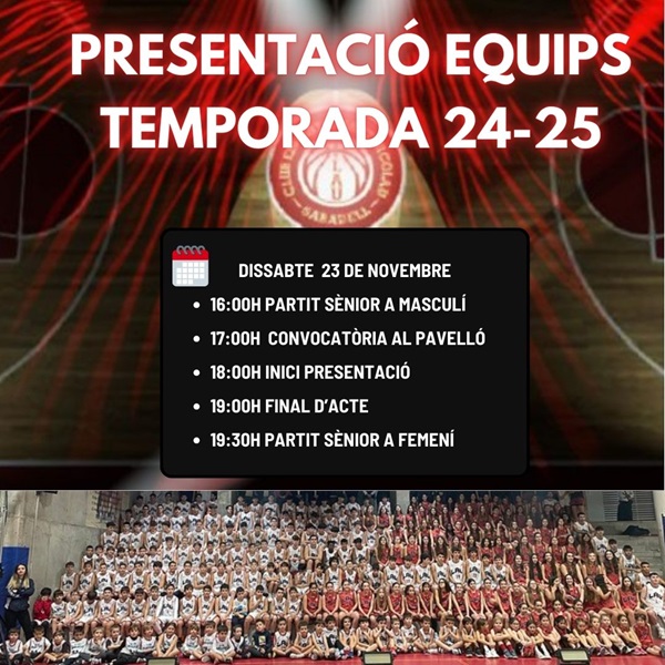 SAVE THE DATE! El proper dissabte 23 de novembre tindrà lloc l'esperada Presentació Oficial dels Equips del CESN d’aquesta Temporada 2024-2025, en el que segur serà un magnífic acte amb tota la #FamíliaLAU i que esperem poder viure amb la presència de tots els esportistes, amics i familiars que formen el nostre Club Esportiu Sant Nicolau.