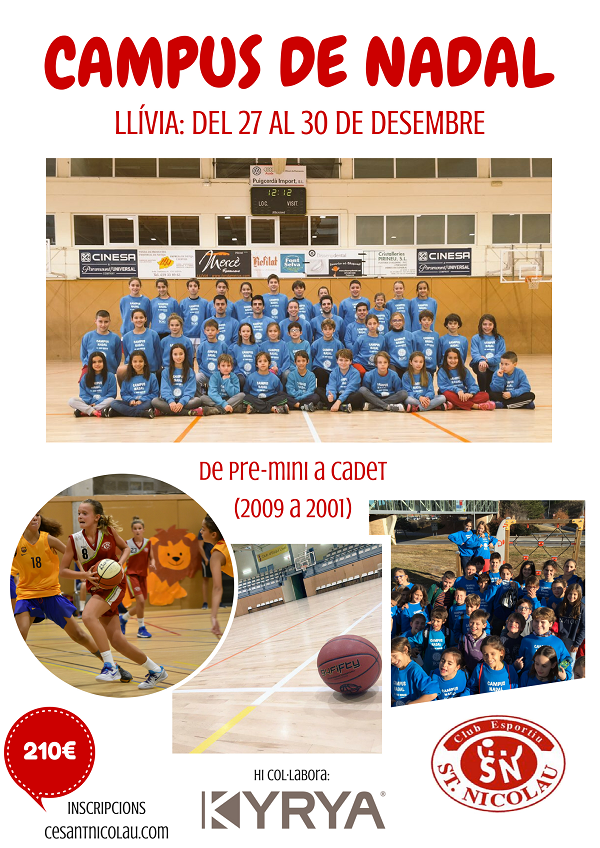 Obrim les inscripcions a l'esperat Campus de Nadal. Enguany, segona edició a Llívia, en un entorn incomparable. Bàsquet, diversió i Nadal en estat pur! Per tots els jugadors i jugadores nascuts entre el 2009 i 2001 (de pre-mini a cadet). PLACES LIMITADES! Després de l'èxit de la 1ª edició la passada temporada, aquest cop no et pots perdre el Campus de Nadal del CESN.