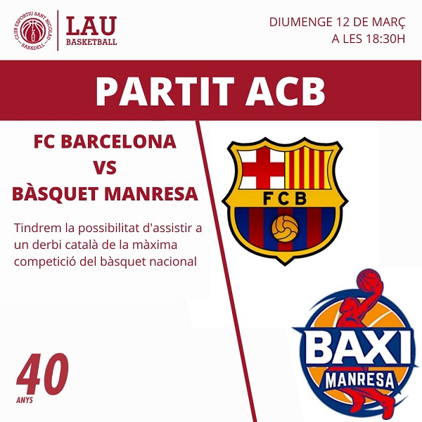 Ens complau informar-vos que el tercer event dels 40 anys tindrà lloc al Palau Blaugrana. Anirem a veure una jornada d’ACB entre Barça i Manresa el diumenge 12 de març a les 18:30. Un duel català ben emocionant pels nostres esportistes. Per tal de poder fer una correcta reserva de les entrades caldrà respondre un formulari.